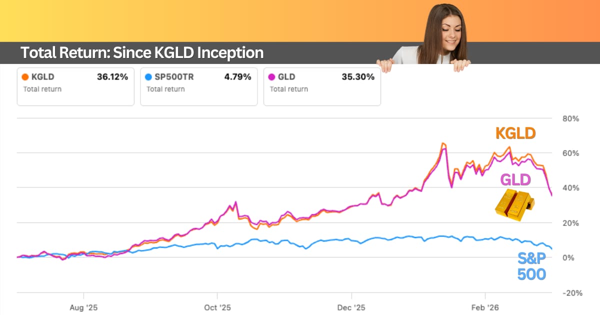KGLD continues to stay a nose ahead of its underlying asset, the GLD gold ETF.