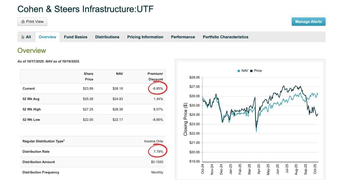 Apart from the higher yield, it’s also worth noting that UTF has shifted from trading at a premium to its Net Asset Value (NAV), to a discount of 8.85%. Buying a fund at a discount to NAV means you receive a higher yield, than if you paid full price for the assets. In this case, the fund generates a 7.1% yield on its assets.